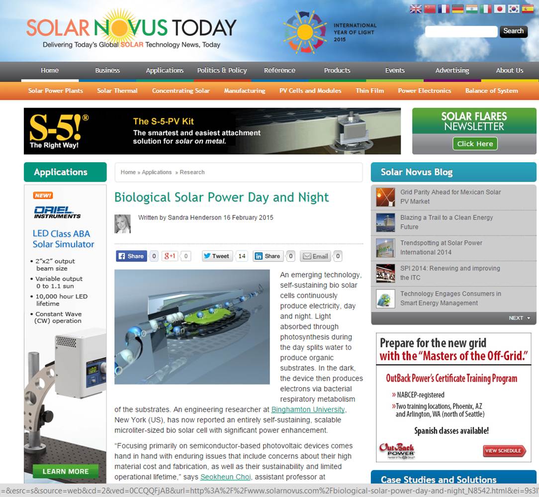 2015. 02. 10 - Our work was reported by Solar Novus Today.