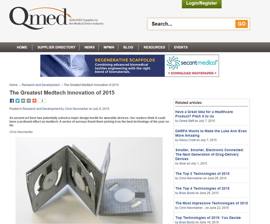 2015. 07. 08 - Our work was selected as the top technology of "The Most Impressive Technologies of 2015" in Qmed Medical Product Manufacturing News