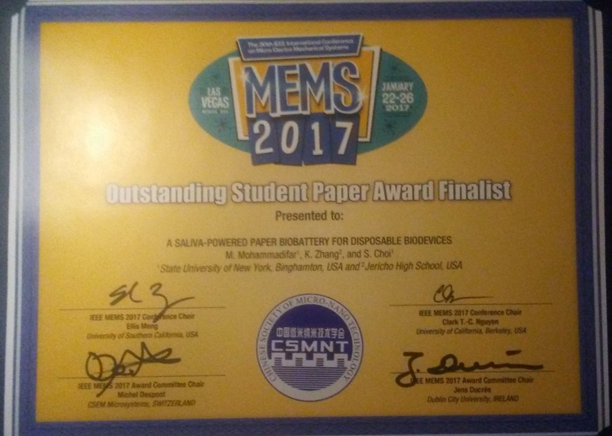 2017. 6. 7 - Our high school student, Kendra Zhang, who worked on paper-based biobatteries, won major awards in multiple research competitions, including Intel International Science & Engineering Fair (1st), Long Island Science & Engineering Fair (1st), New York State Science & Engineering Fair (2nd), Long Island Science Congress (Highest Honors), and WAC Lighting Foundation Invitational Science Fair (2nd).
