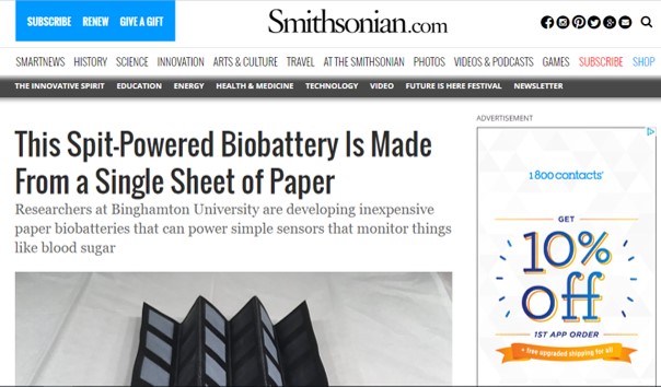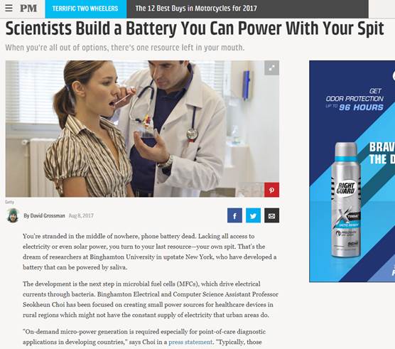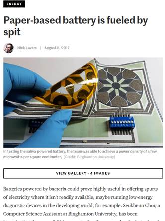 2017. 8. 14 - Many news agencies highlighted our work on saliva-based biobatteries, published in Advanced Materials Technologies. The media outlets include Fox News, ScienceDaily, Popular Mechanics, IFLScience, Electronics360, and many others.