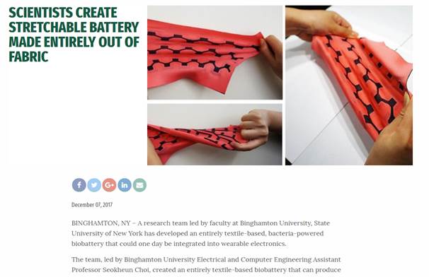 2017. 12. 8 - Many news agencies highlighted our work on textile-based biobatteries. The media outlets include ScienceDaily, TechXplore, NEWSWISE, and many others.