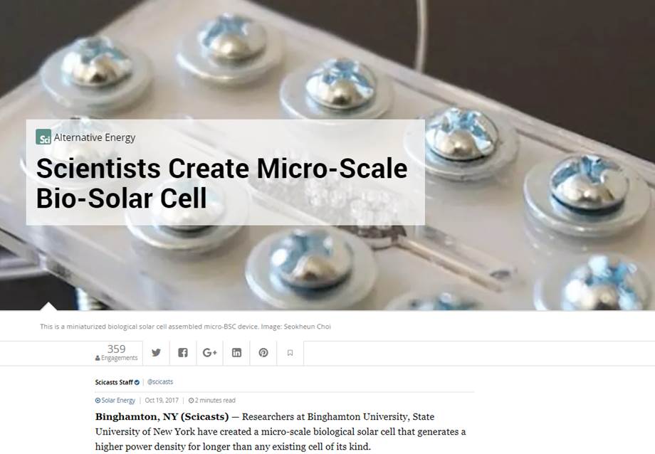 2017. 10. 19 - Many news agencies highlighted our work on micro-scale bio-solar cells. Media outlets included ScienceDaily, SciCasts, EurekAlert, Energy Harvesting Journal, and many others.