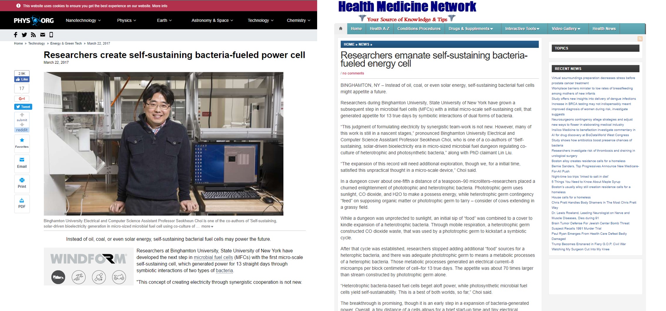 2017. 3. 26 - Many news agencies highlighted our work on biological solar cells, published in Journal of Power Sources. The media outlets include Phys.org, ScienceDaily, ScienceNewsline, Electronic Products, HealthMediciNet, and many others.