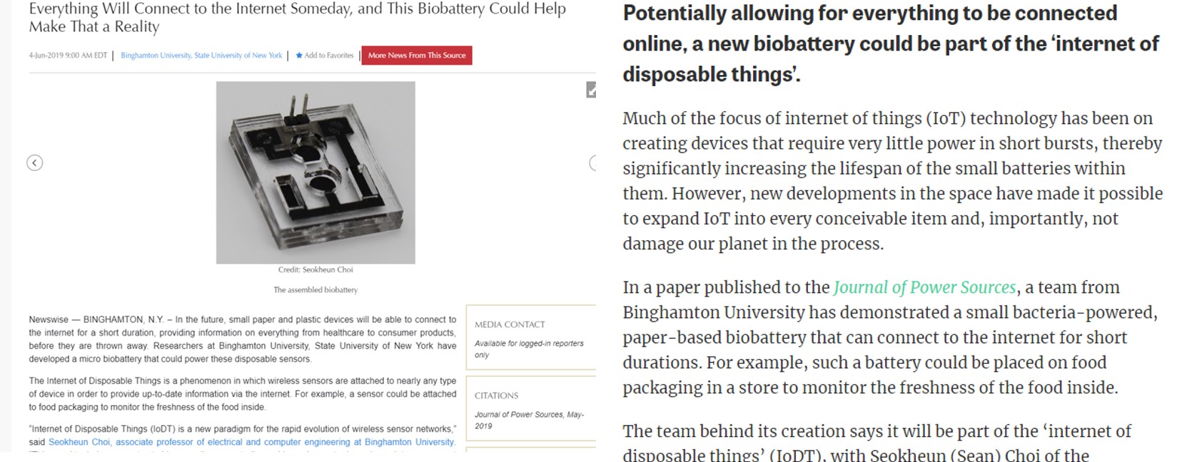 2019. 6. 6 - Many news agencies highlighted our work on solid-phase biobatteries for IoT, published in Journal of Power Sources. Media outlets included ScienceDaily, Siliconrepublic, Newswise, and many others.