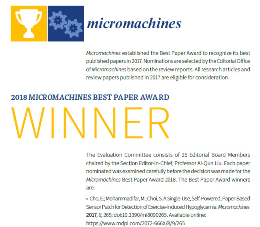 2019. 1. 8 - Our paper entitled "A single-use, self-powered, paper-based sensor patch for detection of exercise-induced hypoglycemia," published in Micromachines, has been selected as the best paper in 2018.