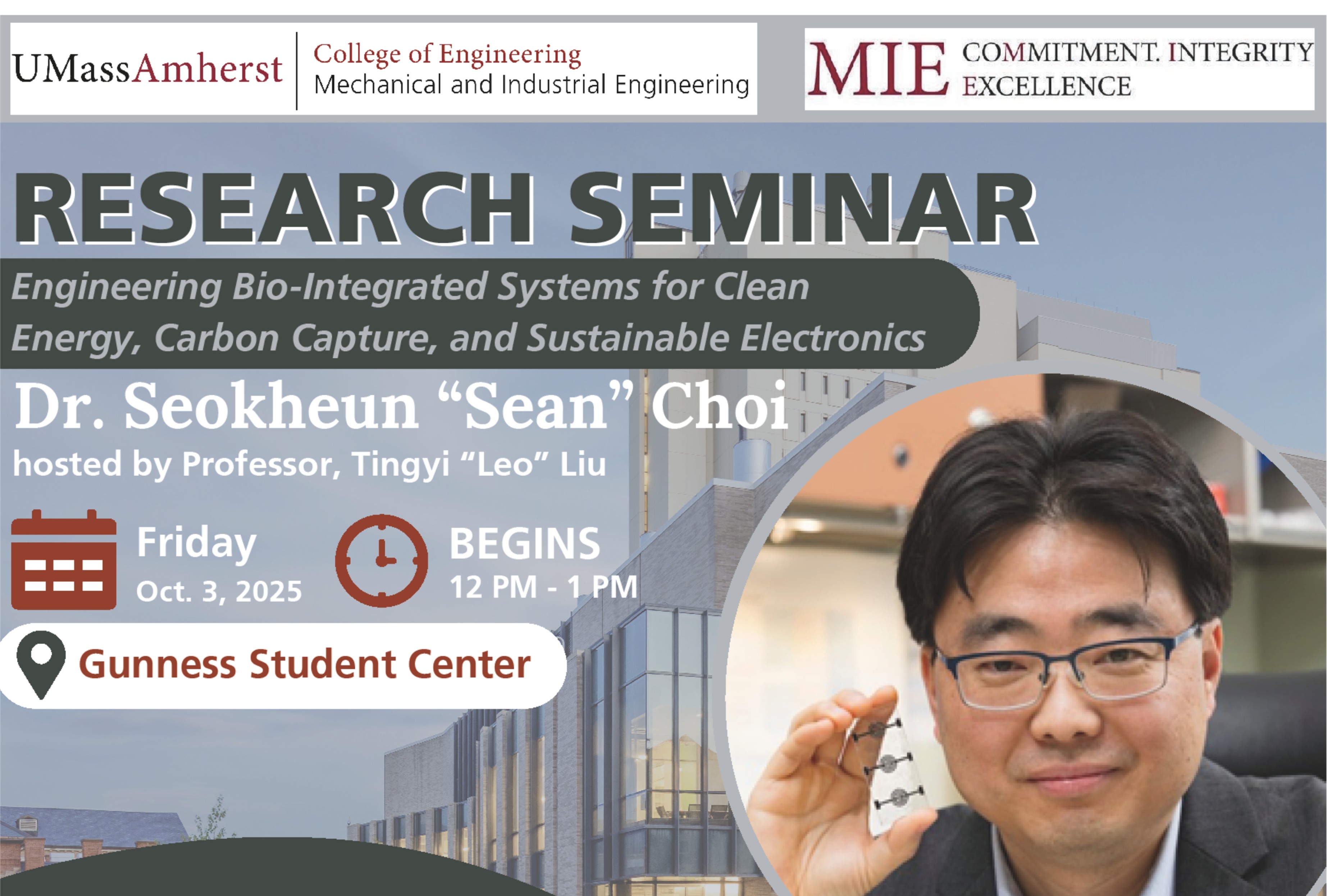 2025. 9. 12 - Prof. Choi has been invited to deliver a guest lecture, titled "Engineering Bio-Integrated Systems for Clean Energy, Carbon Capture, and Sustainable Electronics," at the Department of Mechanical and Industrial Engineering, University of Massachusetts Amherst, on October 3rd, 2025.
