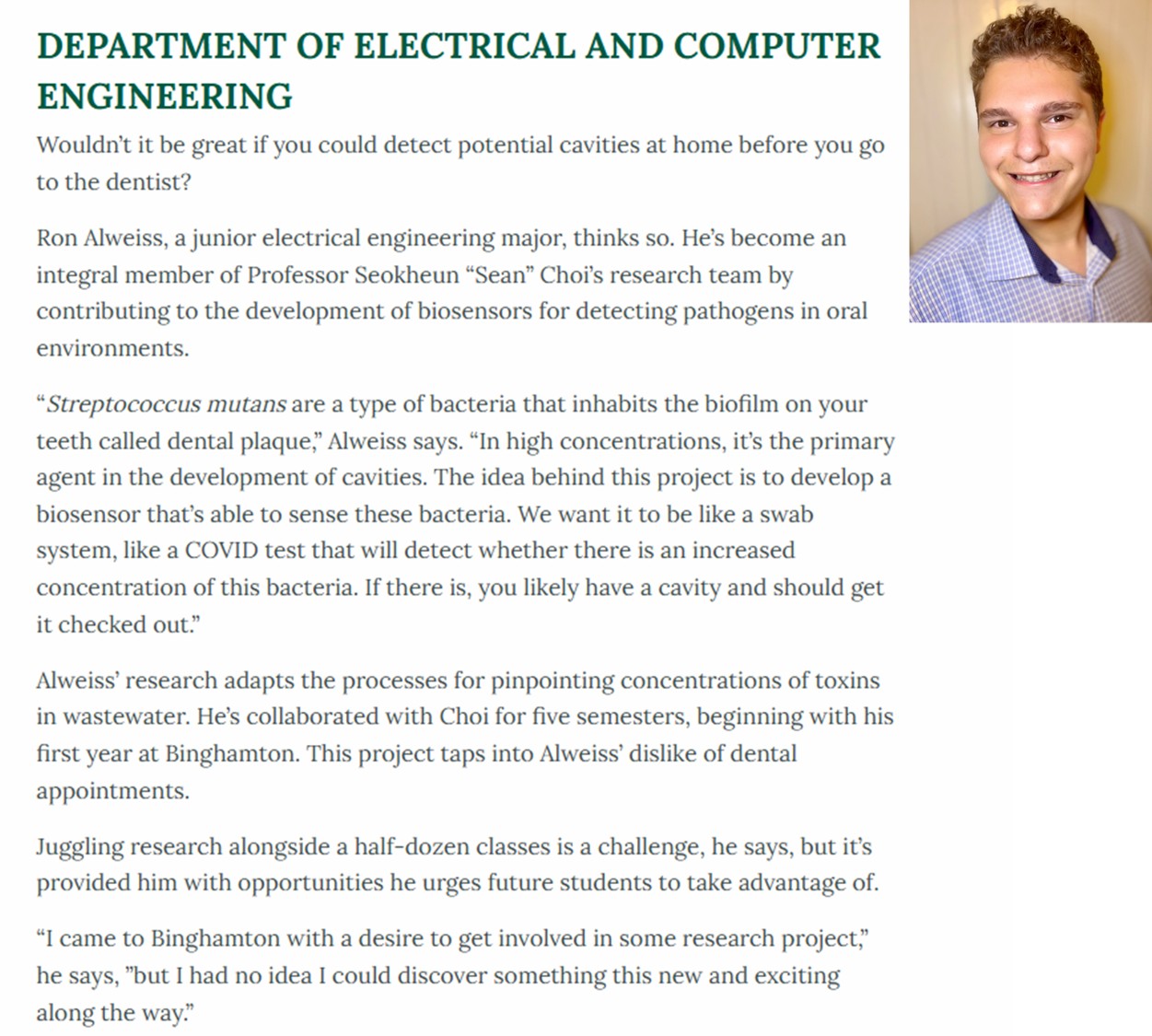 2025. 6. 23 - Our undergraduate researcher, Ron Alweiss, has been featured in Watson News for his work on detecting pathogens in oral environments.
