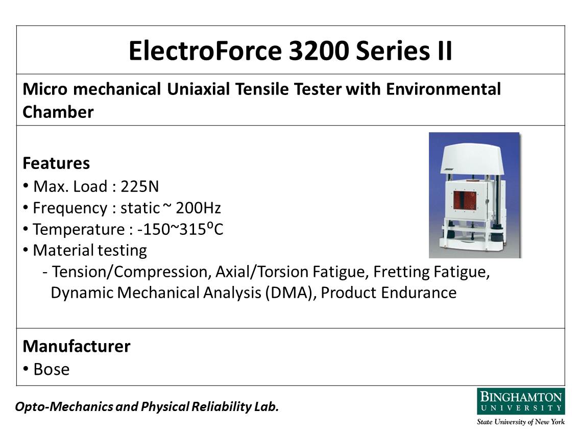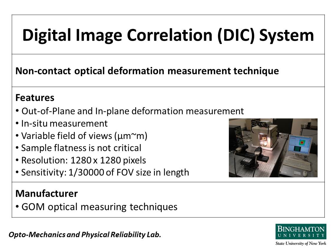 Our GOM ARAMIS Digital Image Correlation (DIC) system can be used to conduct non-contact measurement of 3D displacement, strain, strain rate, etc. It is a powerful tool for material characterization and reliability analysis.